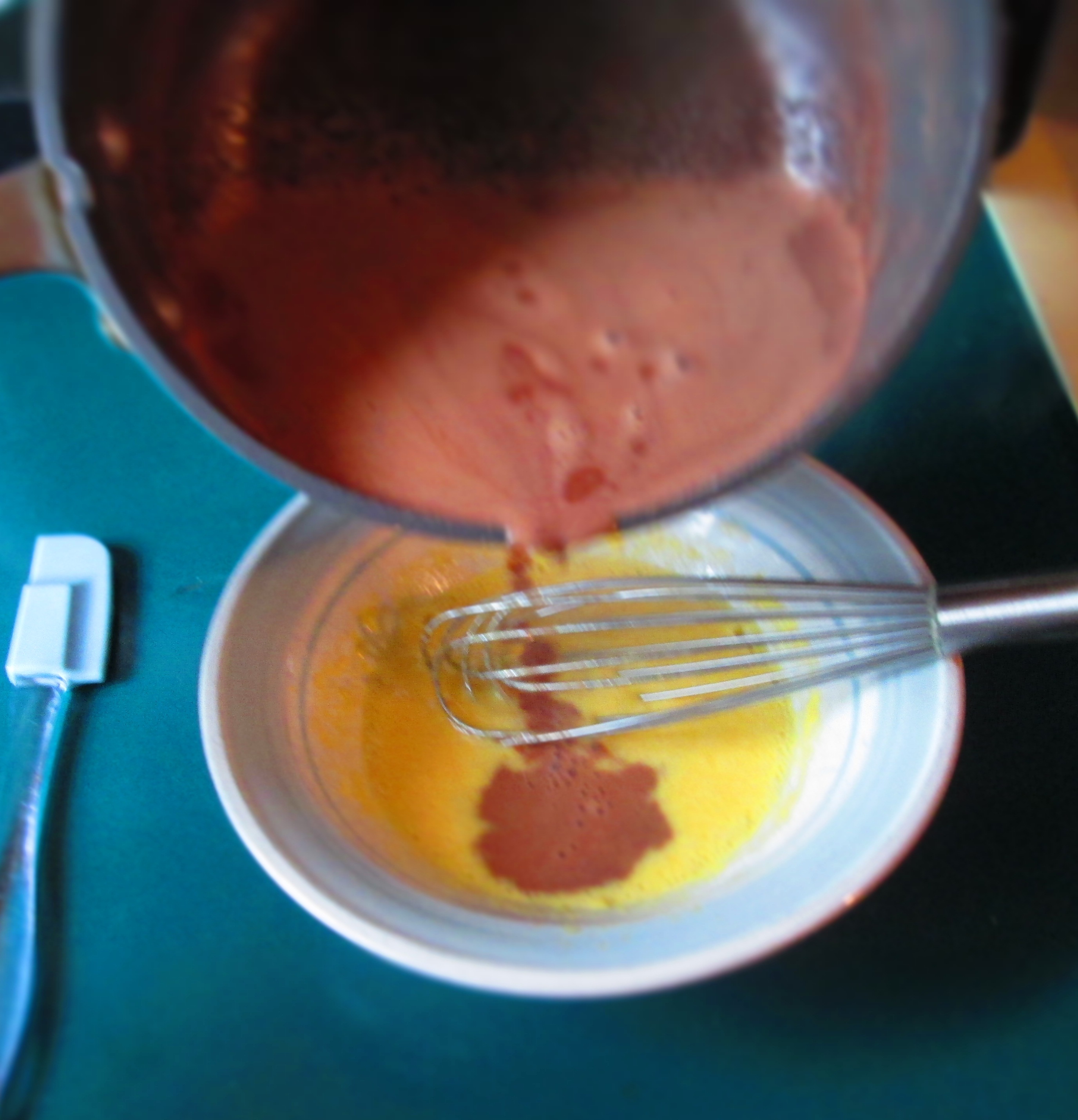 Combine remaining milk mixture with maple crystals and cocoa in a small non-aluminum saucepan. Bring to a simmer over medium-high heat, then lower heat. Add a small amount to the egg mixture in the bowl and whisk together.