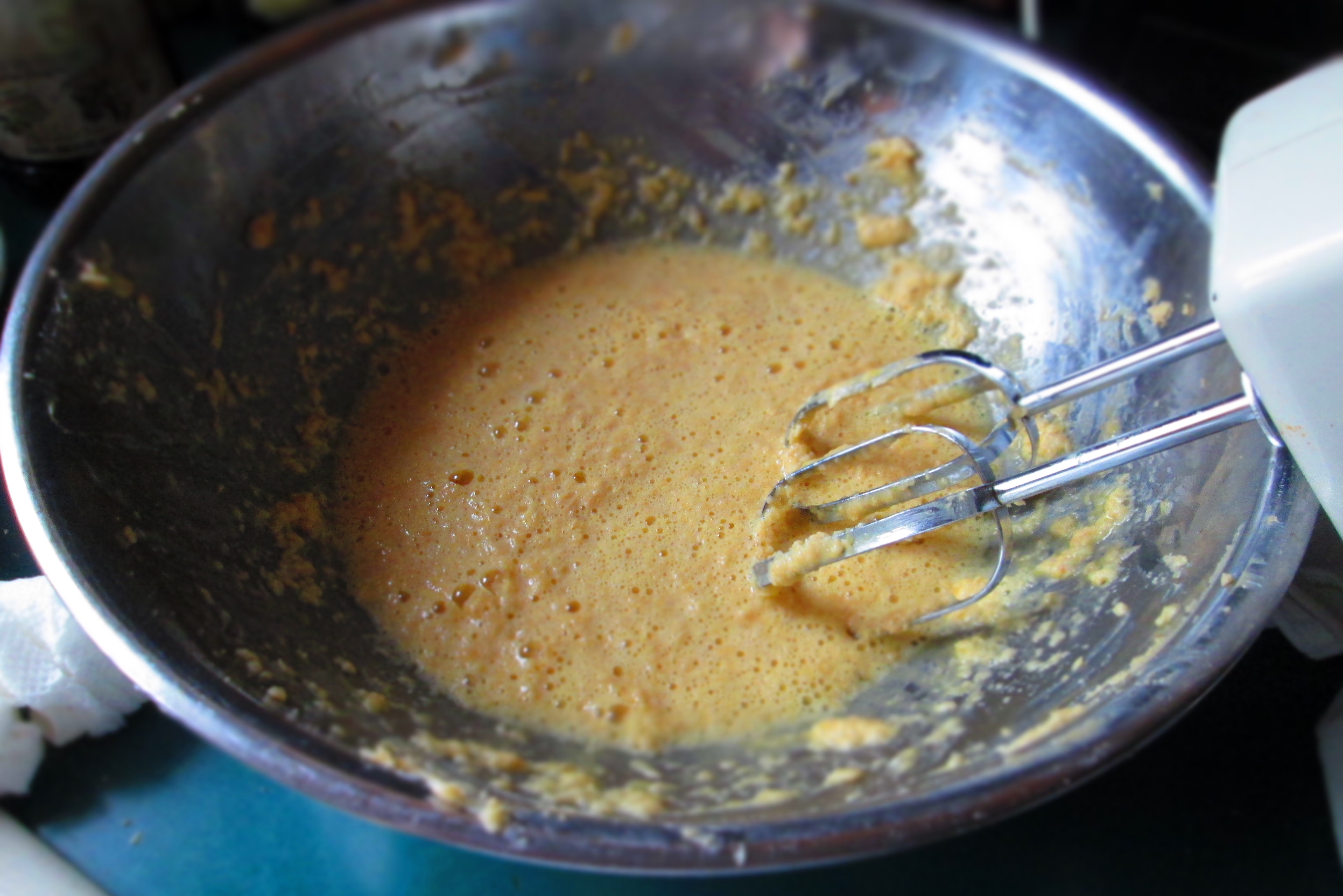 Beat in the eggs, one at a time, blending in each one before adding the next. Add the buttermilk and vanilla.