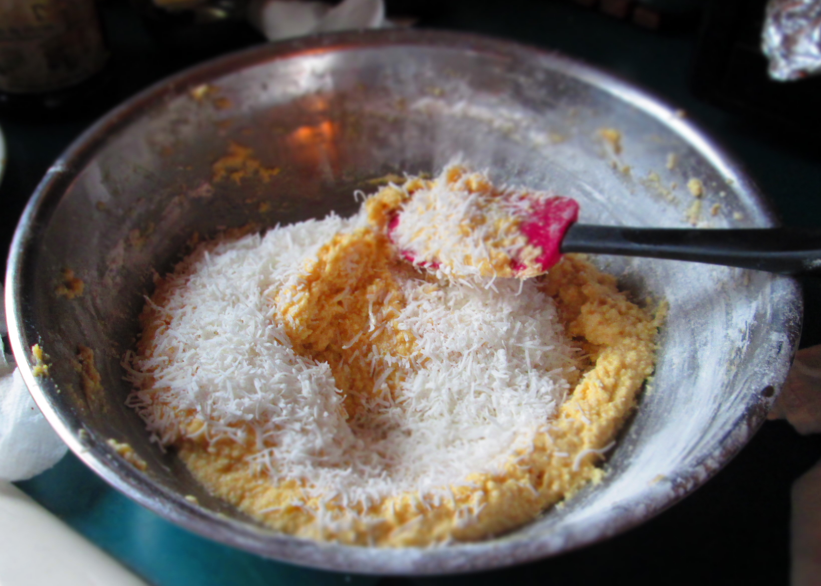 Add the flour in 3 batches; mix in each batch. Stir in the coconut flakes.