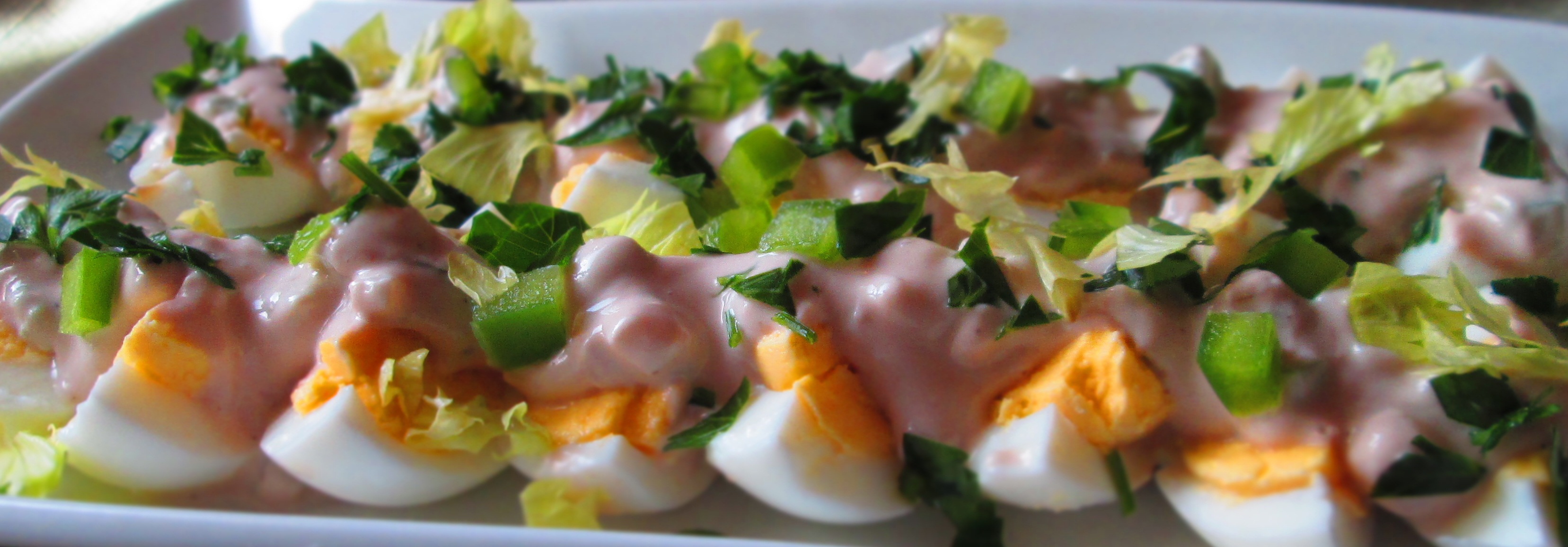 Place dollops of the dressing over the eggs, spreading it out so that all the eggs are covered. Garnish as desired. Keep chilled until ready to serve.