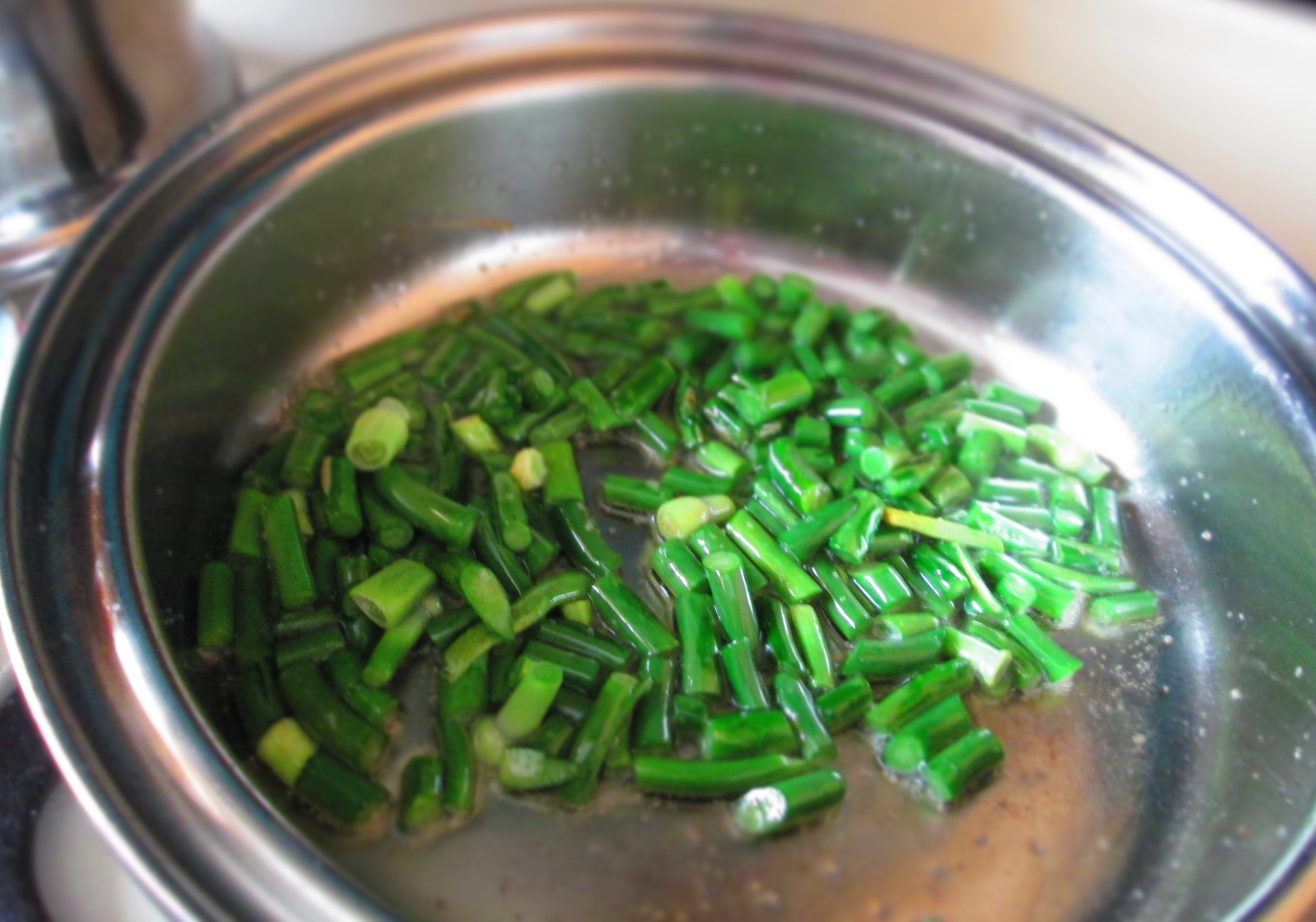 Meanwhile, heat the oil in a medium skillet. Add the garlic scapes and sauté until they’re tender and start to brown.