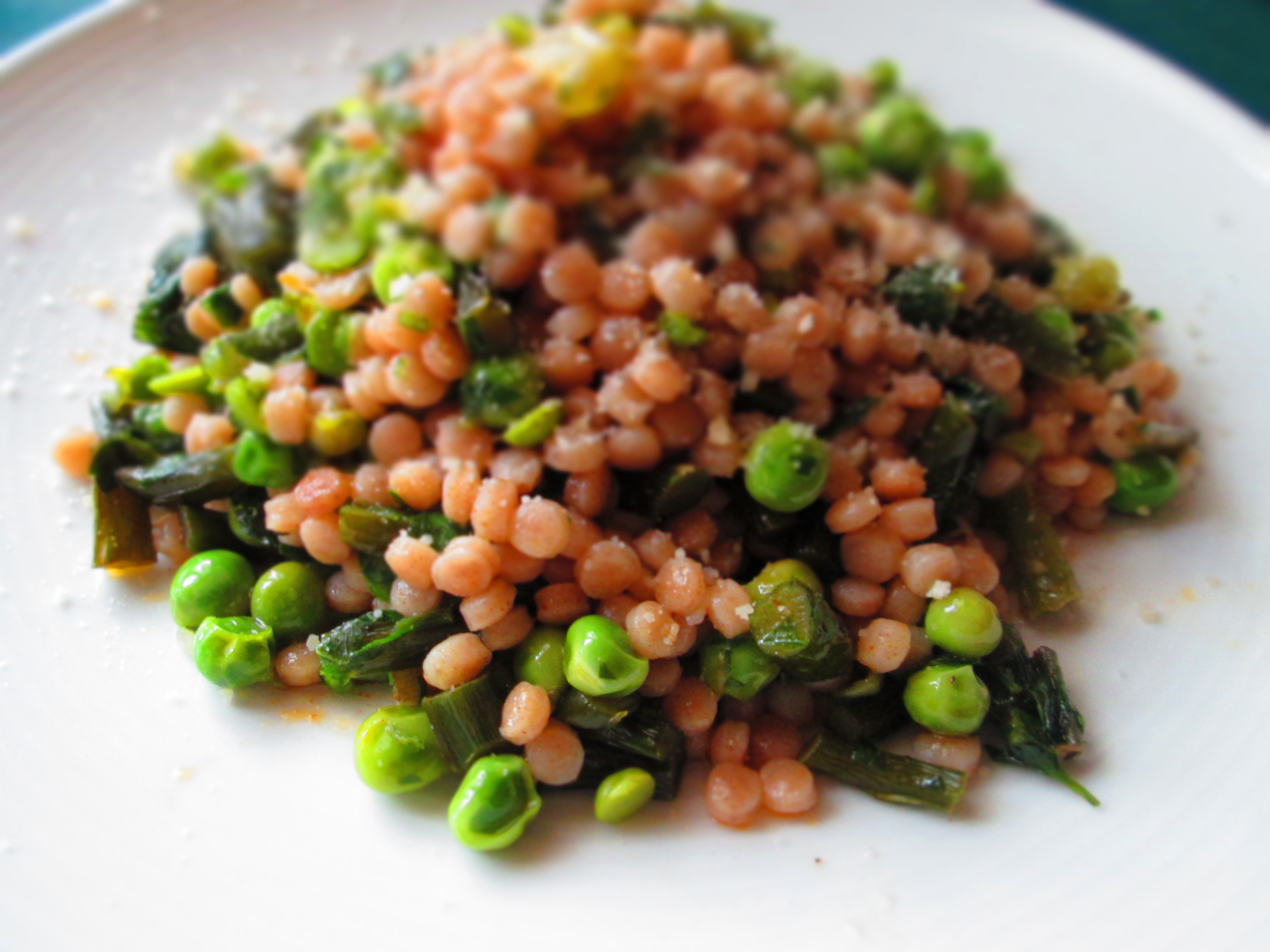 When I was at the farmer’s market this past week, I not only found garlic scapes, I found fresh peas as well (also quick to come and go at the market). I decided to combine them with some whole wheat Israeli couscous and the result was fabulous.
