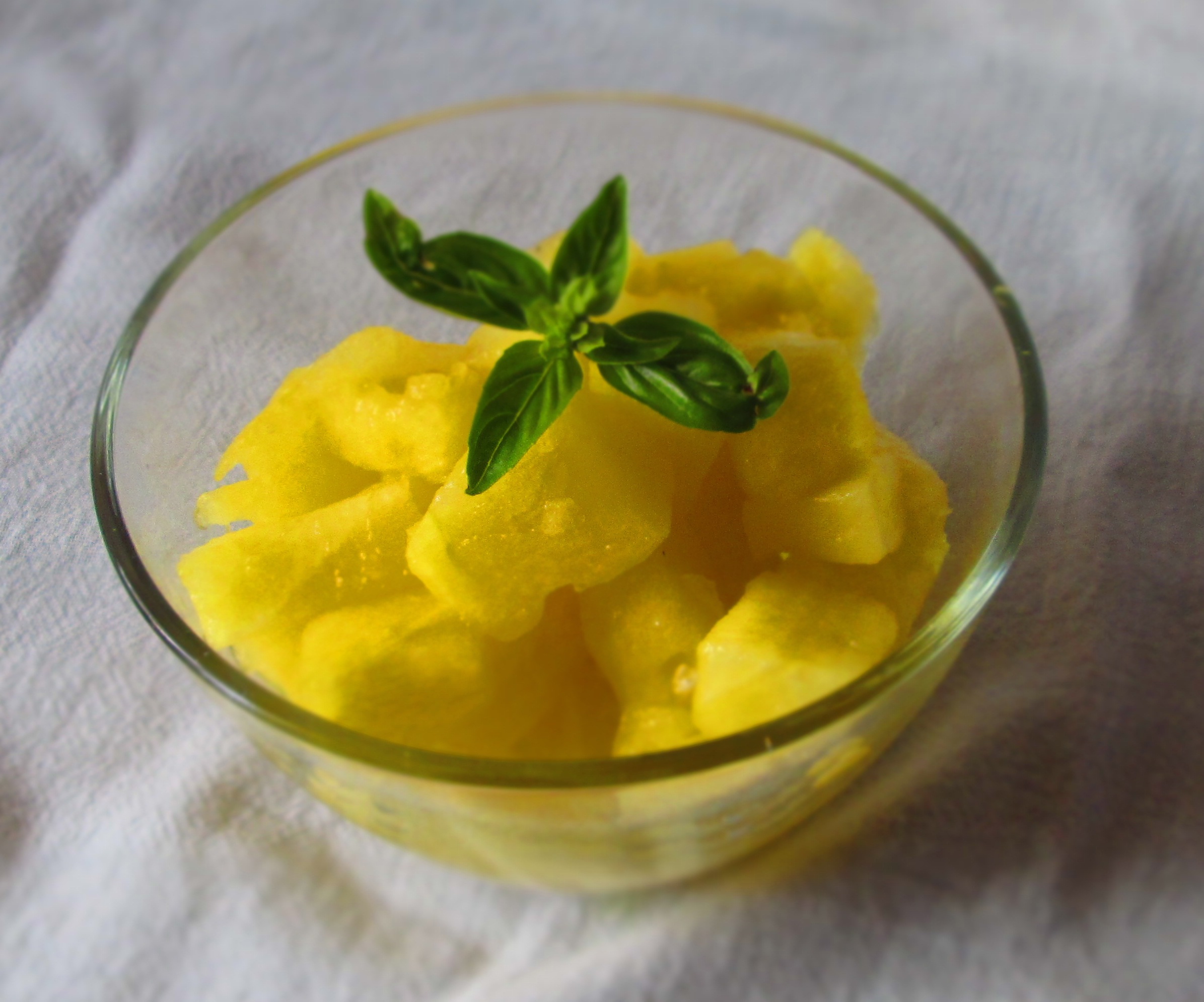 Place the watermelon in a bowl and pour the booze over it. Let it sit for an hour. If you want, mash it with a fork and make a slushy. That’s it. If you want to make it pretty, put some herbs on top, but that is entirely optional.