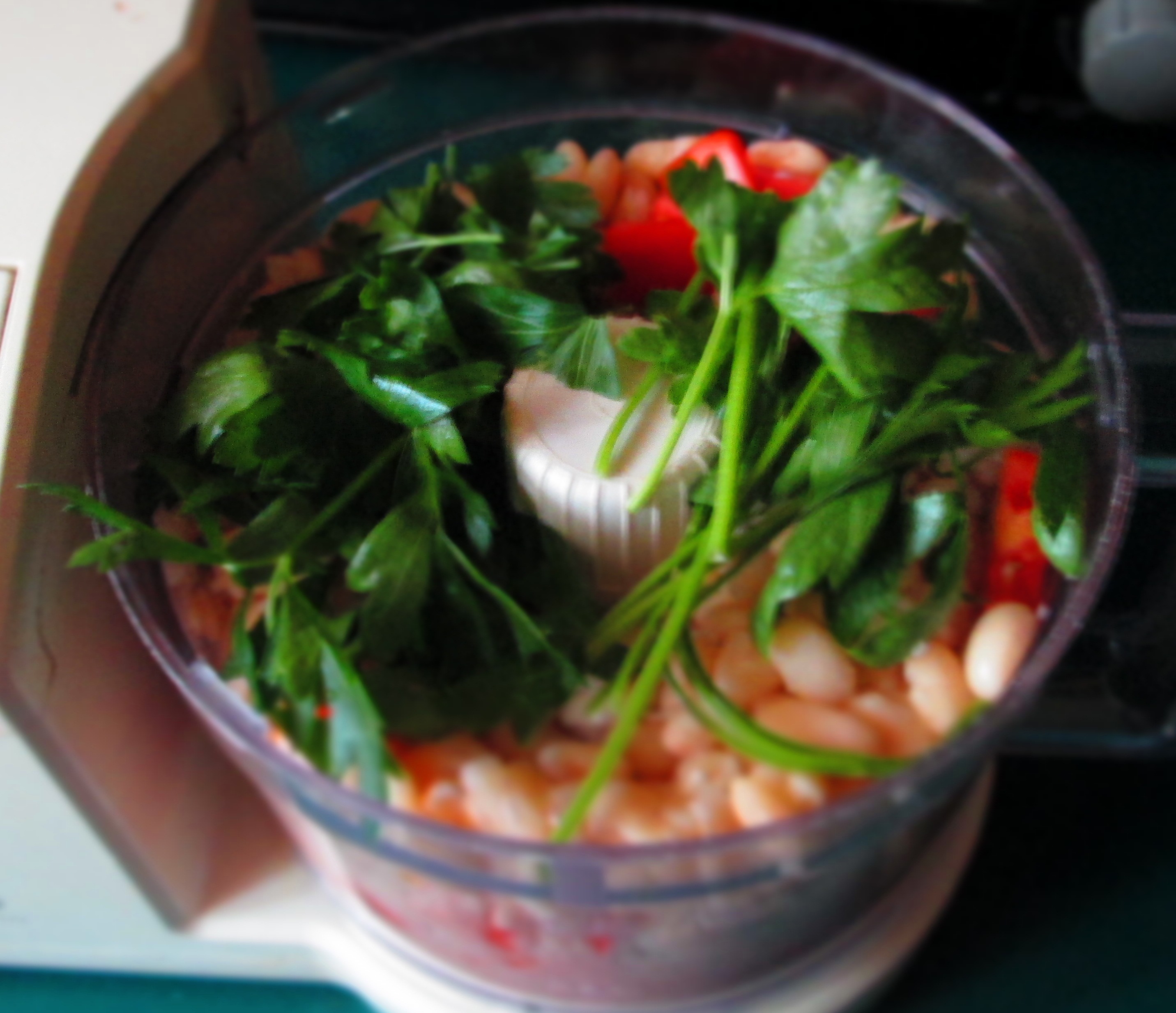 I had cooked up a huge batch, so I needed to come up with something else. And, as I also said last time, because it’s summer, I’ve had access to a bunch of tomatoes. Well, both they went into a food processor for a white bean spread. With a few additional ingredients, this is a flavorful, filling, yet light, snack. It’s also perfect to taking to a picnic or barbecue.
