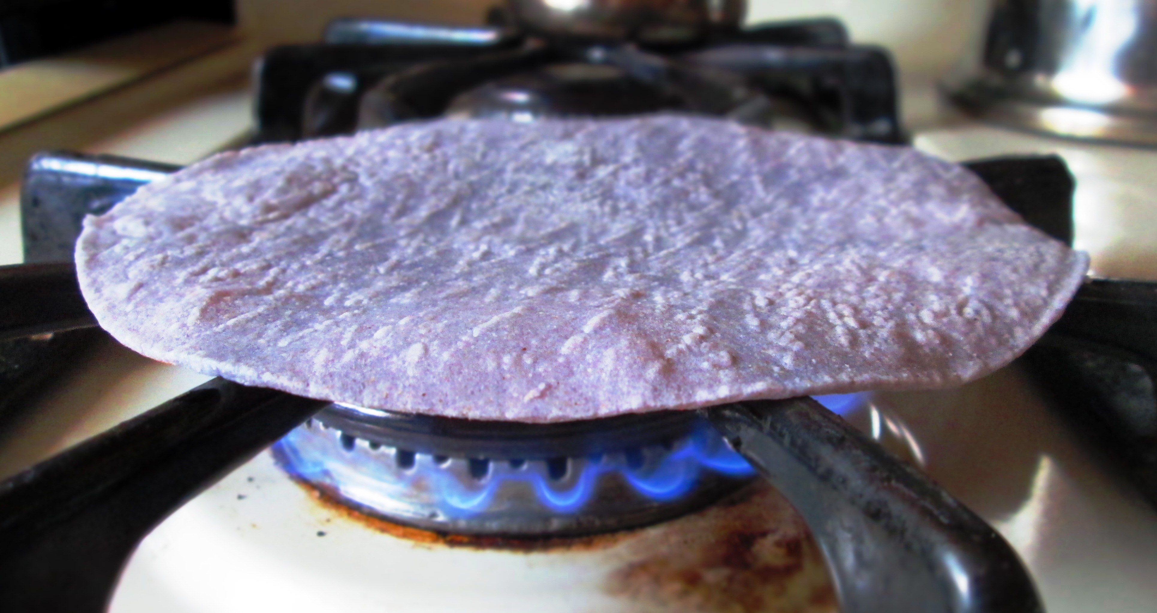 Toast 4 tortillas over a flame (either on your stovetop gas burner or a grill) until lightly browned in spots. Lay them on a baking sheet.