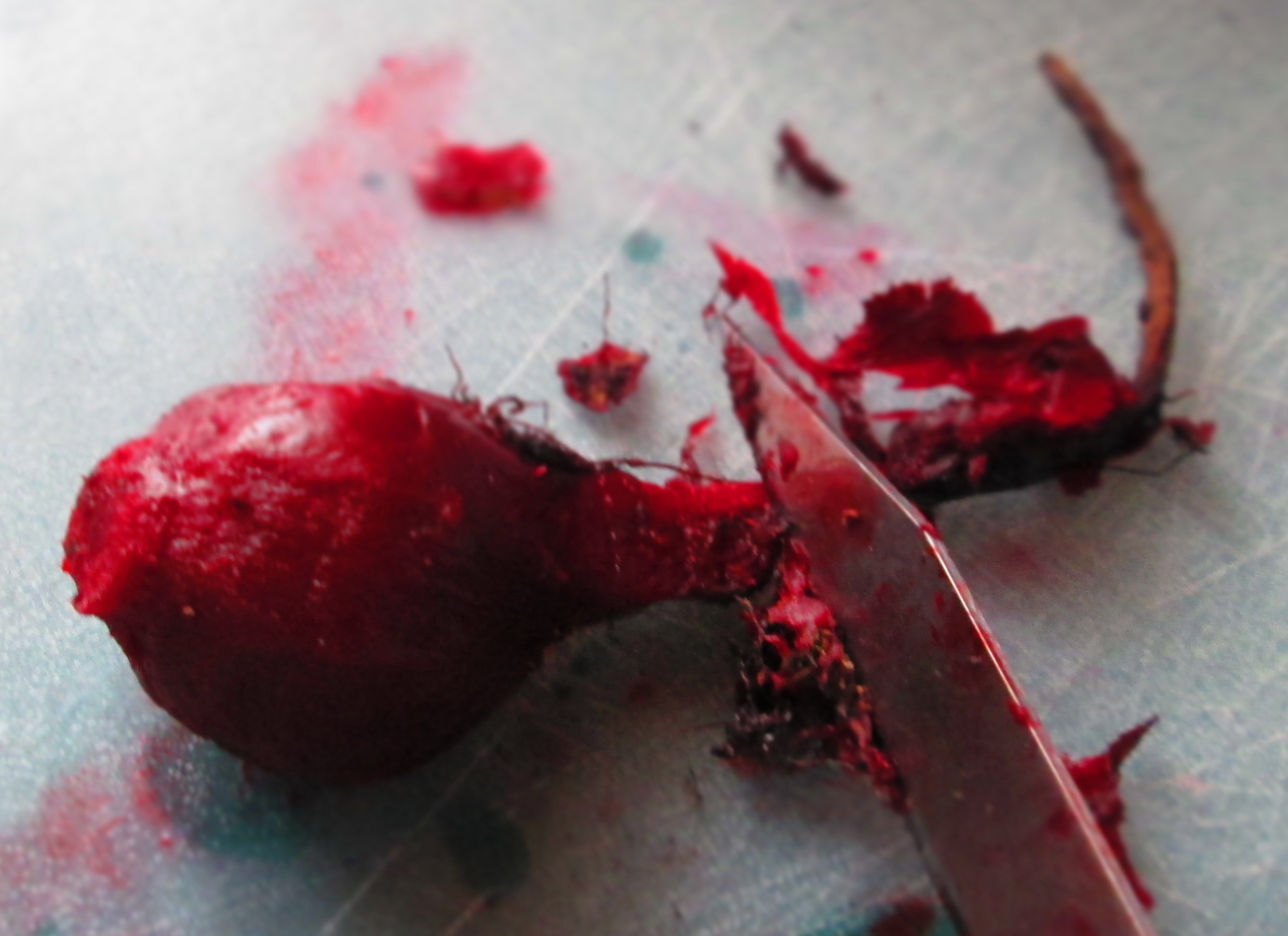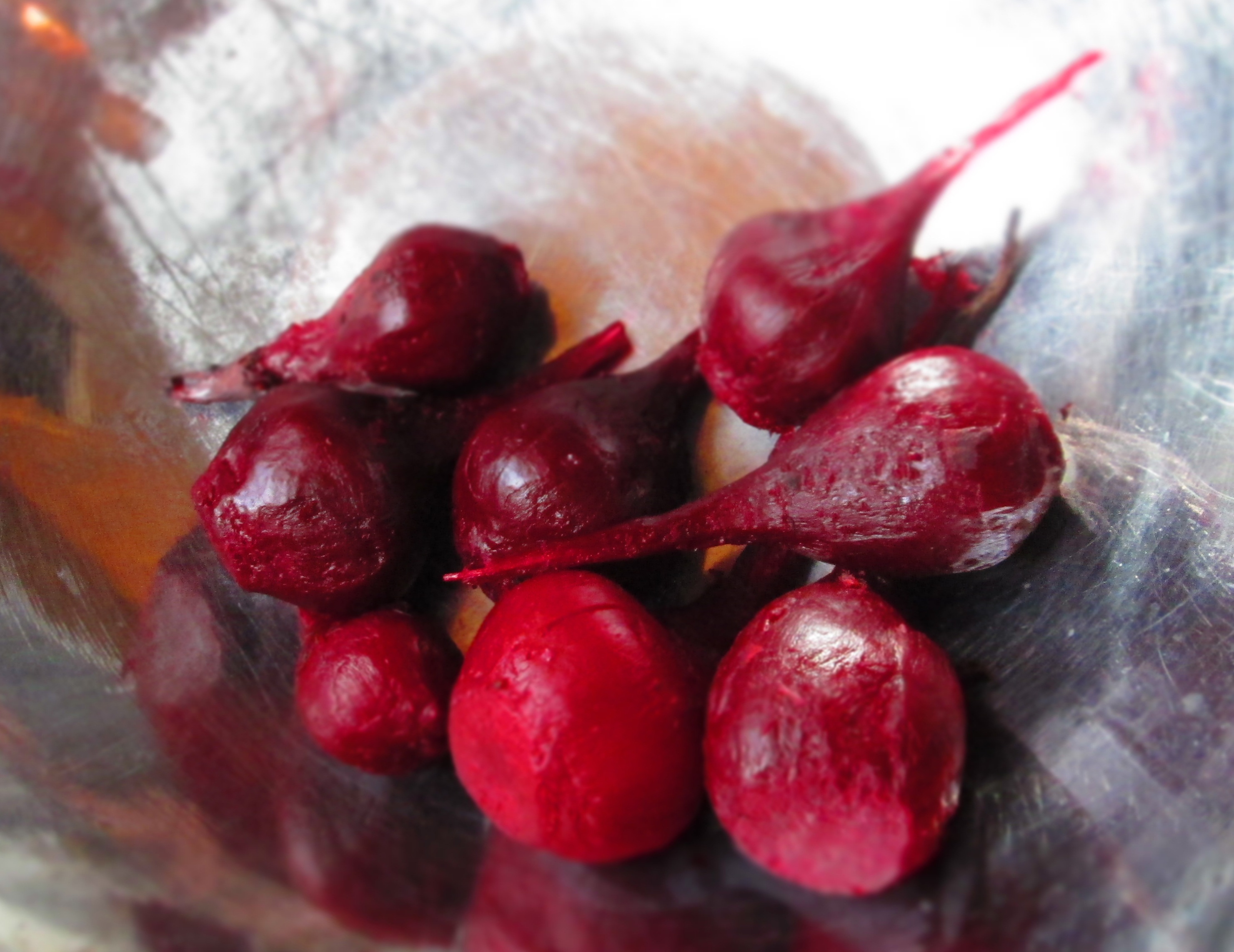 Once again, I was lured by the Siren’s song of the farmers’ market. I picked up some lettuce, some carrots, some cipolline onions. But what caught my eye this week was the box of baby beets. Gigantic red globes can be found anywhere, but baby beets are not quite as easily found. At least not for me. So I pounced on them.
