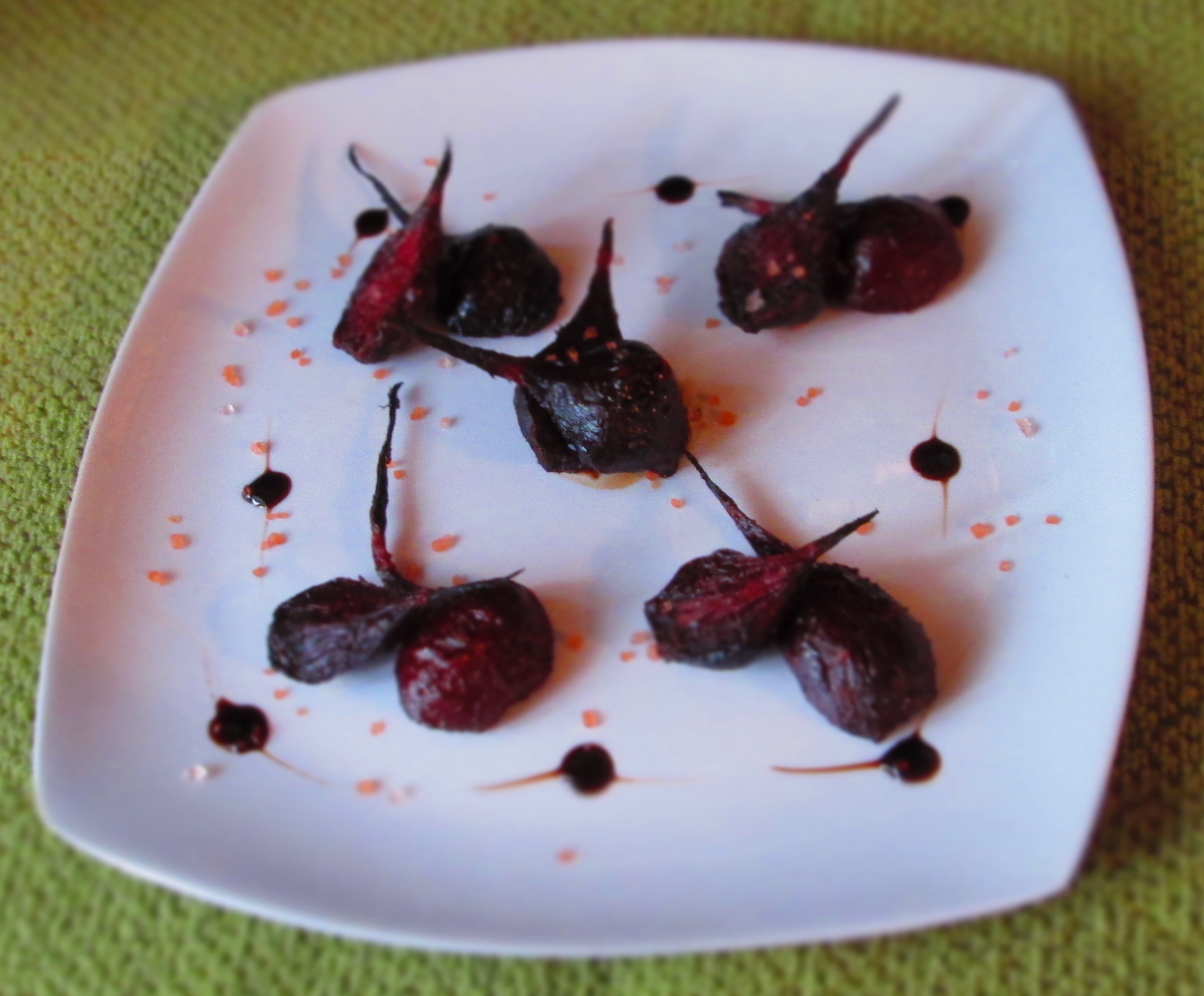 First, I roasted the beets, then cut them in half, and roasted them again to caramelize them. I made a balsamic reduction and used that as a dressing. Finally I finished the dish off with a sprinkling of Hawaiian pink sea salt.