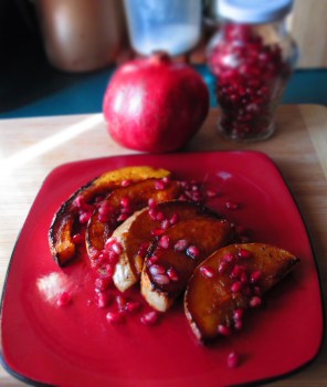 Transfer cooked squash to a serving platter. Drizzle sauce over top, sprinkle on some fresh pomegranate seeds, and serve.