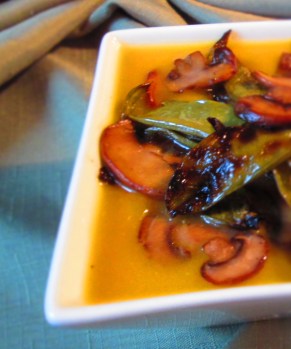 Butternut Bisque with Roasted Snow Peas and Caramelized Mushrooms