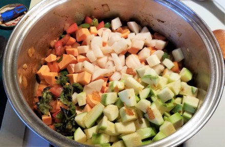 Deglaze the pot with ¼ cup of the apple juice; scrape up the brown bits from the bottom of the pot. Add the bell pepper, carrots, tomato, and a pinch of salt; sauté 5 minutes. Add the potato, sweet potato, shishito peppers, zucchini, chili powder, and a pinch of salt; cook 5 minutes.