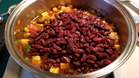 Add the beans, tomato sauce, mushroom stock, remaining apple juice, black pepper, and 1 cup water. Bring this to a boil. Lower the heat to medium-low and simmer, covered, for ½ hour.