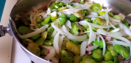 The original recipe did not indicate how well the onion should be sautéed, so I decided on soft and translucent. It also said nothing about whether or not to skin the fava beans. Now, here’s the thing about fava beans. When you remove fresh favas from their pods, they have a skin, or jacket. Although this skin is edible, it can sometimes be tough and cause gas. It’s a much more pleasant experience to eat favas without their skin. The creators of this recipe may have assumed that the readers know to remove the skins, but that’s not always the case. So, I’ve included that step in my instructions.