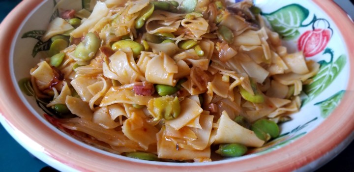The first recipe in my Regions of Italy project is Pasta con le Fave, or Pasta with Fava Beans. This dish is typical of the Vomano valley of Abruzzo. Although the original recipe calls for marjoram, fresh marjoram can be difficult to find. Oregano is related to marjoram and is more readily available. Note that it’s also stronger in flavor, so you may want to cut back a little on it, if strong herb flavor isn’t your thing.