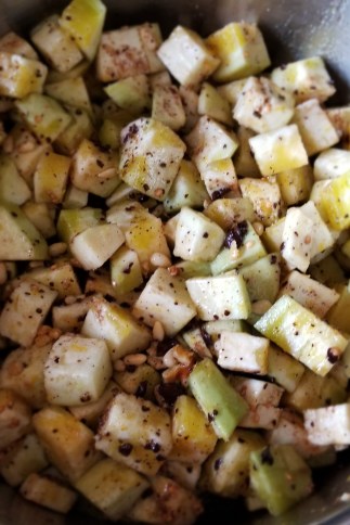 Trim and peel the eggplant, then cut them into small cubes.
