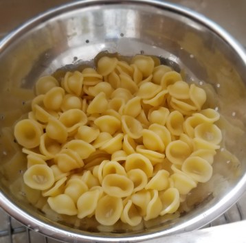 The second alteration was not my fault. I went to the store to buy cavatelli, and thanks to Murphy’s Law, they had every type of pasta you could possibly want except the one I needed, cavatelli. I had a bag of orecchiette at home, so I decided to just use that. Orecchiette means “little ears,” and also do a good job of catching sauces in their “cups.”