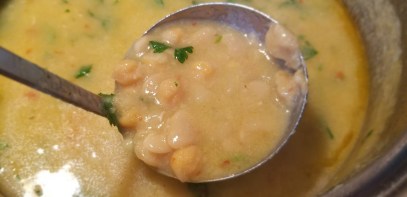 The beans, both kinds, definitely needed to be presoaked. I had to cook this soup for a very long time, and I had to keep adding more and more water. The chickpeas eventually softened and cooked through, but the lima beans never quite got there. They remained, in the end, a bit on the crisp side.