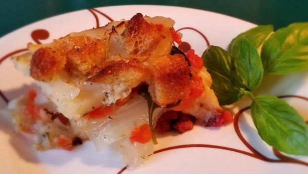 Make another layer of tomatoes, ½ teaspoon salt, potatoes, onion, bread crumbs, and olive oil (skip the basil). If the tomatoes released juices, pour it in slowly from the side. If there are no juices (or not much), add ¼ cup water.