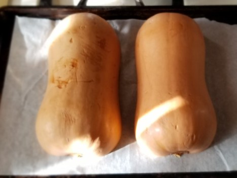 Preheat the oven to 350 degrees F. Line a baking sheet with parchment paper. Cut the squash in half lengthwise and scoop out the seeds. Lay the squash cut side down on the baking sheet and bake until soft, 40 to 60 minutes.