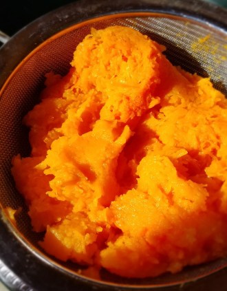 Remove the squash from the oven and let it cool. Scoop out the flesh and discard the shells. Place the flesh in a mesh strainer and cover with a dish. Weigh that down with something heavy (like a tomato can) to remove excess liquid. Alternatively, you can place the flesh in cheesecloth and squeeze out the liquid.
