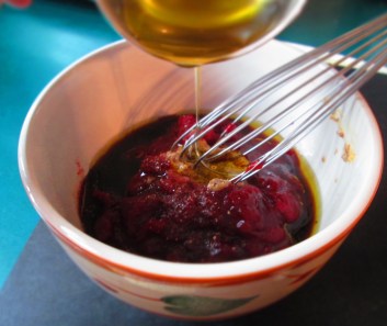 There are many things you can do with leftover cranberry sauce. One way to use it up is to make a dressing with it, and I’ve done just that. I paired homemade cranberry sauce here with baby greens and Anjou pears. So that the cranberry doesn’t overwhelm the delicate ingredients, I strained the dressing.