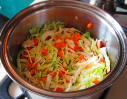 it at a farmers’ market somewhere, grow it yourself, or order it online. The book suggests using Swiss chard leaves as a substitute, but that comes nowhere near replicating lischi. I scoured the many offerings of Asian markets, looking for something similar. Lischi have a grassy, slightly bitter taste, and are long. They look almost like Chinese long beans, only with an oceanic sheen to it, similar to algae, or seaweed. Neither of those things, however, seemed appropriate. In the end, I settled for chives. Not the smallish French, or onion, chives (the kind that you snip on top of your hors d’oeuvres), and not flowering chives, but long, flat-leaf chives, known as garlic chives. The garlicky flavor is very mild when it’s cooked, and it has a similar strand-like appearance to the lischi.