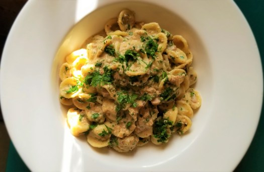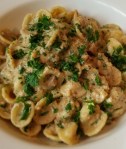 The second alteration was not my fault. I went to the store to buy cavatelli, and thanks to Murphy’s Law, they had every type of pasta you could possibly want except the one I needed, cavatelli. I had a bag of orecchiette at home, so I decided to just use that. Orecchiette means “little ears,” and also do a good job of catching sauces in their “cups.”