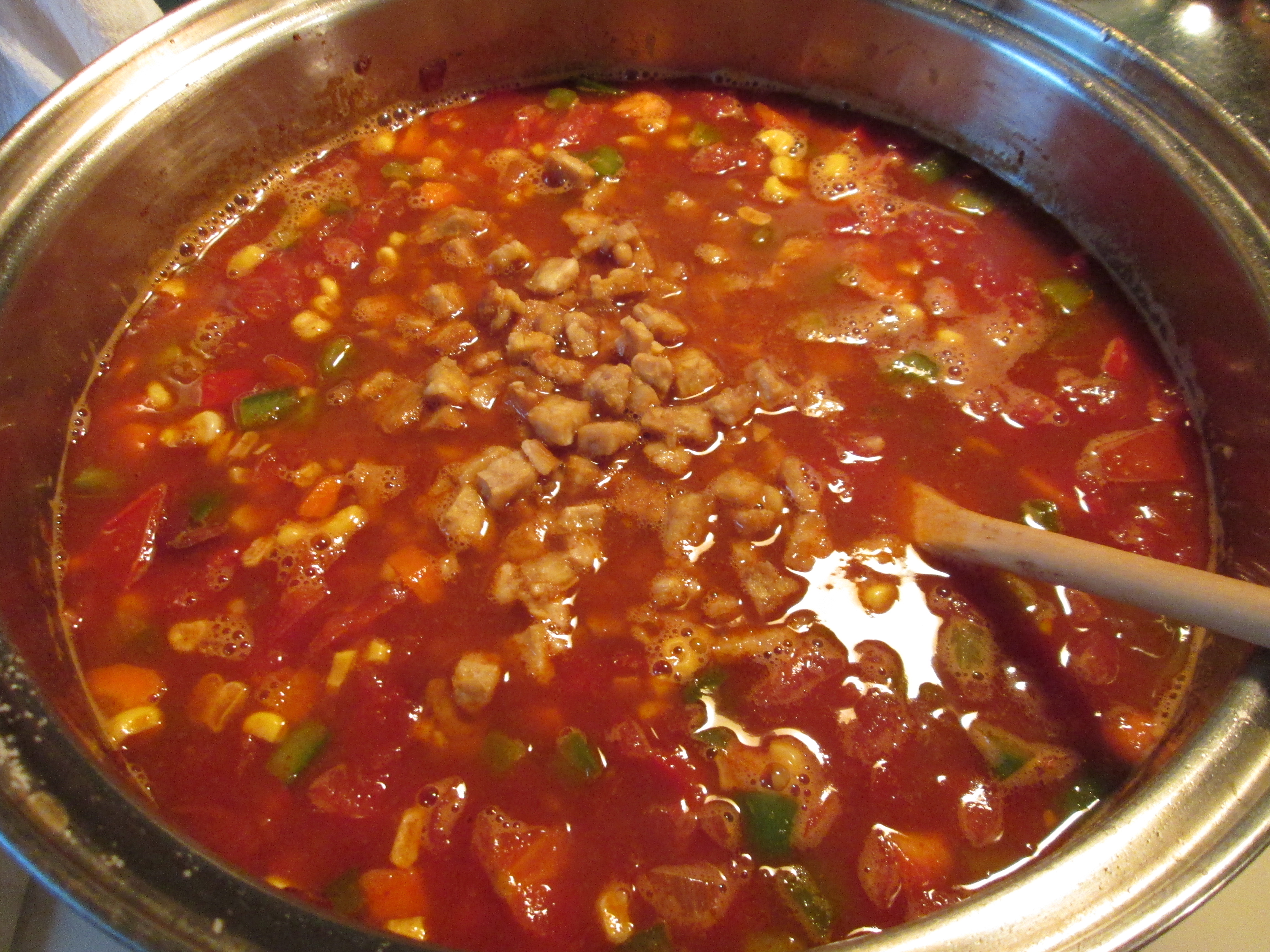 My chili has tempeh in it for extra protein and texture. Tempeh adds a meatiness to chili that makes it appealing to meat-lovers as well. You can either dice, chop, or crumble it, according to your preference. Crumbling it gives it a chopped-meat texture, but I prefer a small dice. It’s important to drain the chili before putting it into the casserole; otherwise, there will be too much liquid. Also, I used homemade corn stock (which I also keep in the freezer), which gave it a fabulous flavor, but any vegetable stock will do.