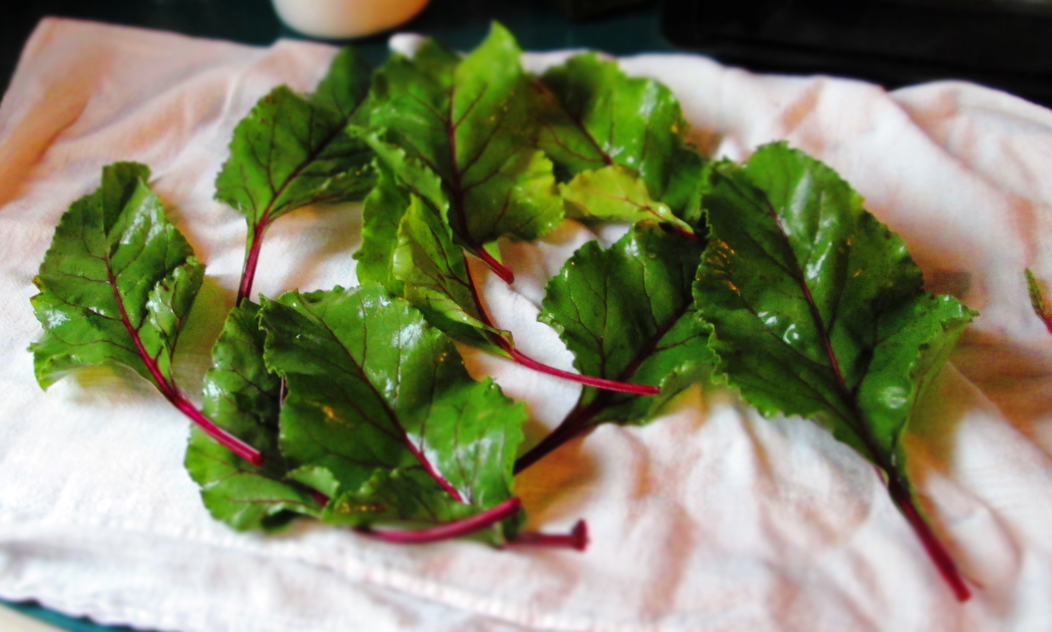 I had purchased beets from the farmers’ market and wanted to do something different with the leaves than the usual saute with olive oil and garlic. As much as I like that particular dish, I think I’ve O.D.d on it. So I started thinking about other ways of using them.