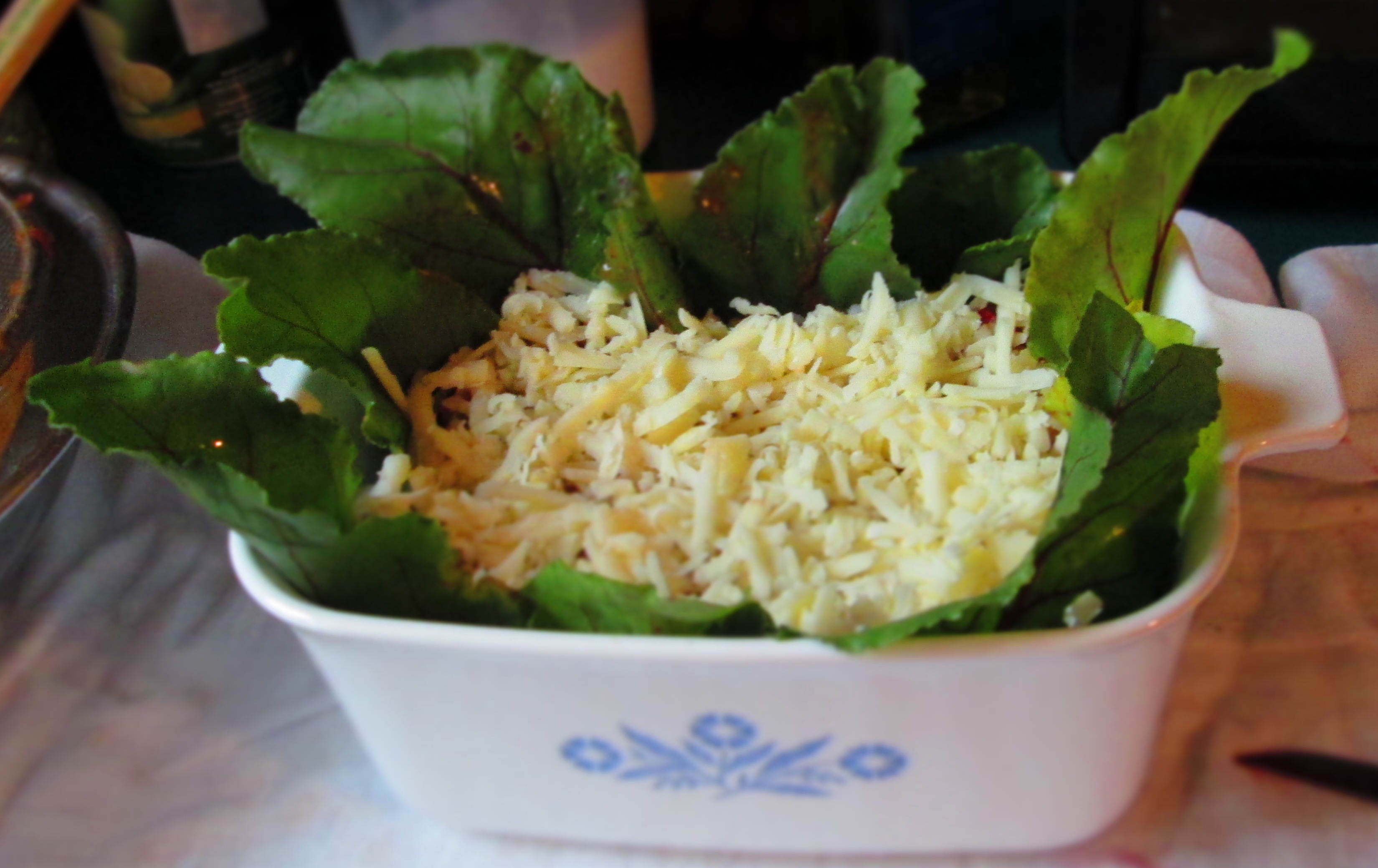 So, I decided to do a casserole, or what Italians call a timbale—a dish that is formed in some sort of mold shape. I used the beet leaves to wrap the chili in a small casserole dish (a 40-year-old cornflower Corningware!), added some cheese, and voilà.