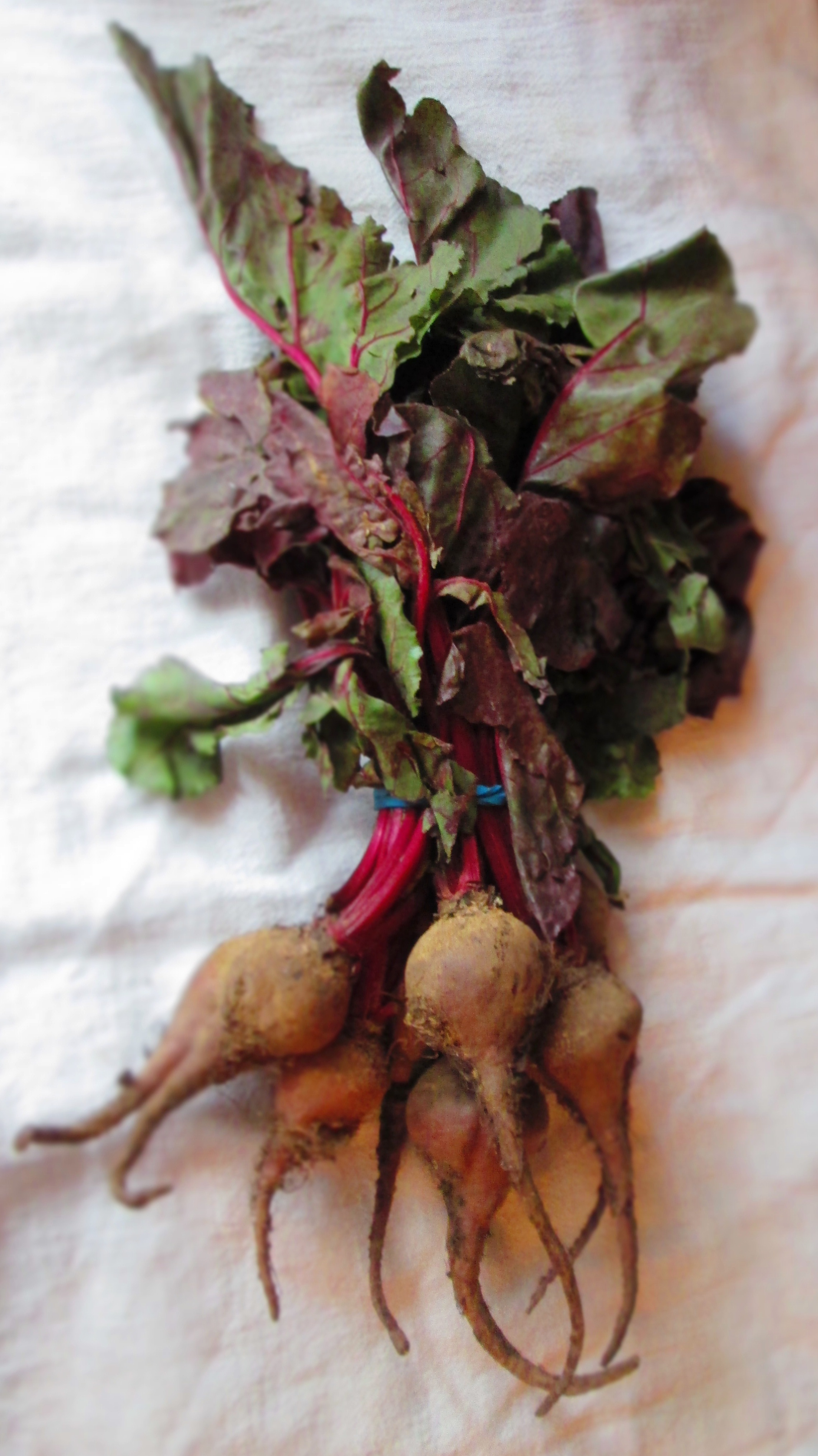 Well, this past week, I lucked out. The farmers’ market that sets up shop outside of my workplace once a week had golden beets, which is not always the case.