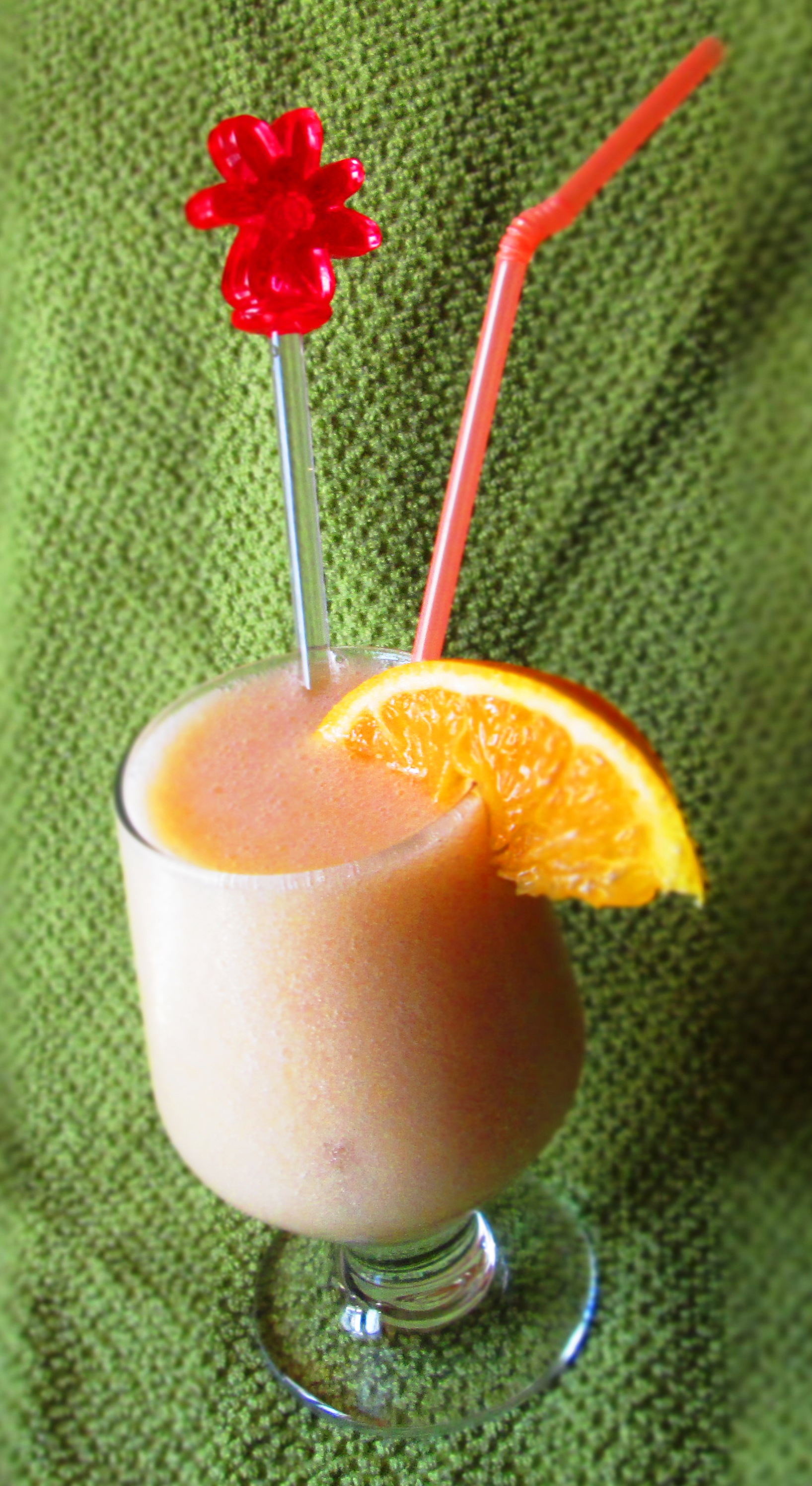 Place all the ingredients in a blender, along with a few ice cubes. Blend until smooth. Pour into 2 glasses and garnish with an orange slice and/or a sprig of mint.