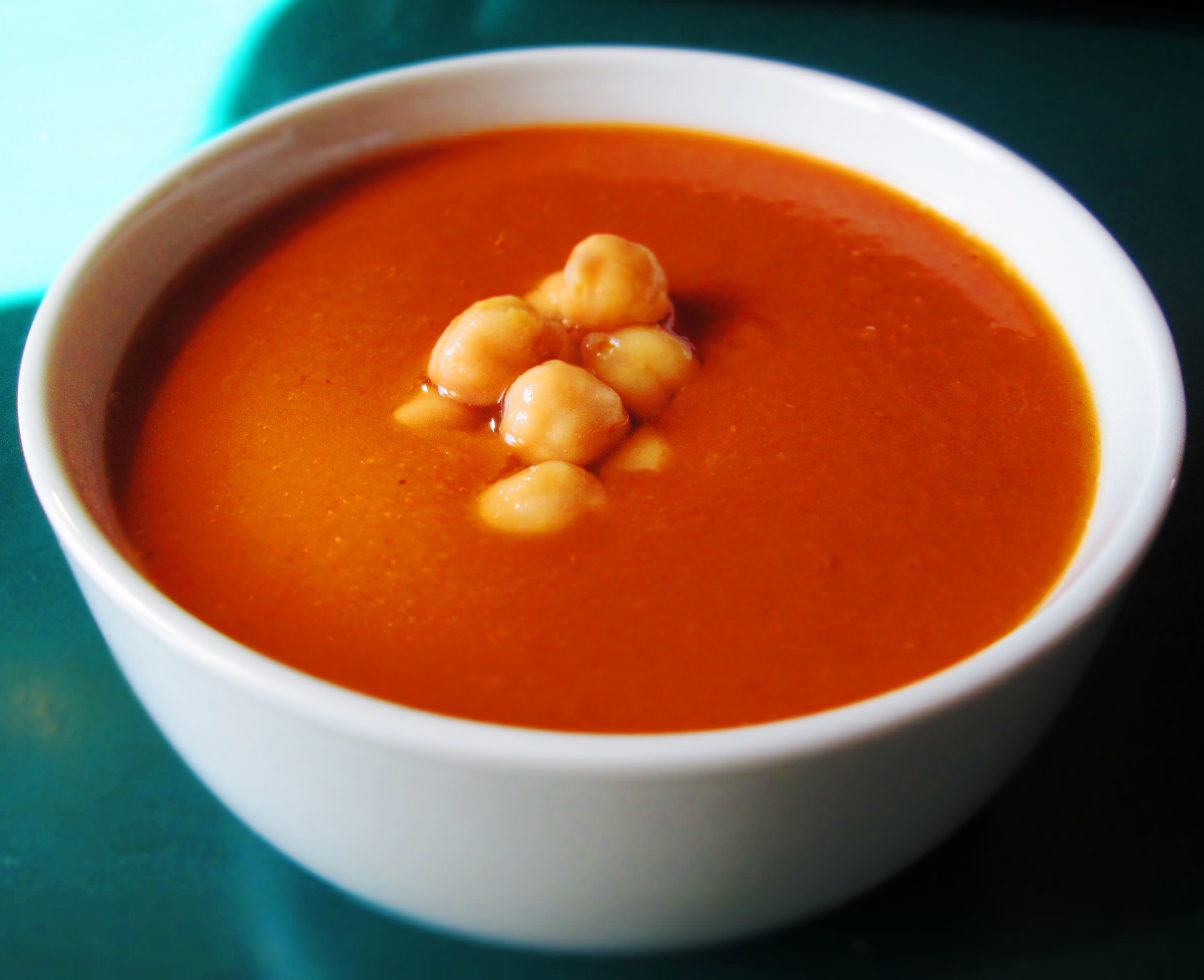 In a wide skillet, heat the oil with the garlic. When the garlic is fragrant, add the paprika and chickpeas. Sauté 5 minutes.