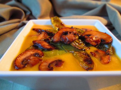 Butternut Bisque with Roasted Snow Peas and Caramelized Mushrooms
