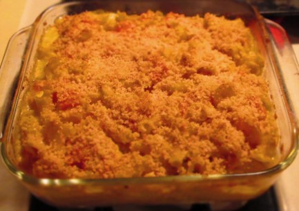 Bring a medium pot of water to a boil. Add the pasta and table salt; cook until the pasta it’s al dente (varies depending on what pasta you use, but generally 8 to 10 minutes). Drain thoroughly and add it to the squash.Meanwhile, melt 3 tablespoons of the butter in a medium pan. Stir in the flour and whisk for about 2 minutes. Whisk in the milk and cook, whisking often, until the mixture thickens, about 5 minutes. Add the mustard, nutmeg, 1 teaspoon kosher salt, and black pepper to taste.Stir in the cheddar and let it melt in. Pour into the baking dish with the squash and pasta. Mix well.Melt the remaining butter in a small pan. Add the parmesan and bread crumbs and stir to coat. Spread this over the mac ‘n’ cheese. Bake until it’s bubbly and a bit browned on top, about 30 to 35 minutes. Enjoy!