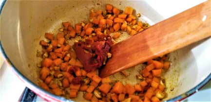 Meanwhile, in another large pan or Dutch oven, heat the remaining oil. Add the peppers, potatoes, and a pinch of salt and sauté until the potatoes start to take on color. (This could take anywhere from 8 to 15 minutes, depending on the size of your pan and how spread out the potatoes are. In my case, it took longer because I chose to make the stew in my 2-quart Le Creuset Dutch oven, which is my new favorite pot and I look for any reason to use it. One of these days, when my ship comes in, I will splurge on that 5-quart Le Creuset.) Stir frequently, as potatoes want to stick to pots and pans.