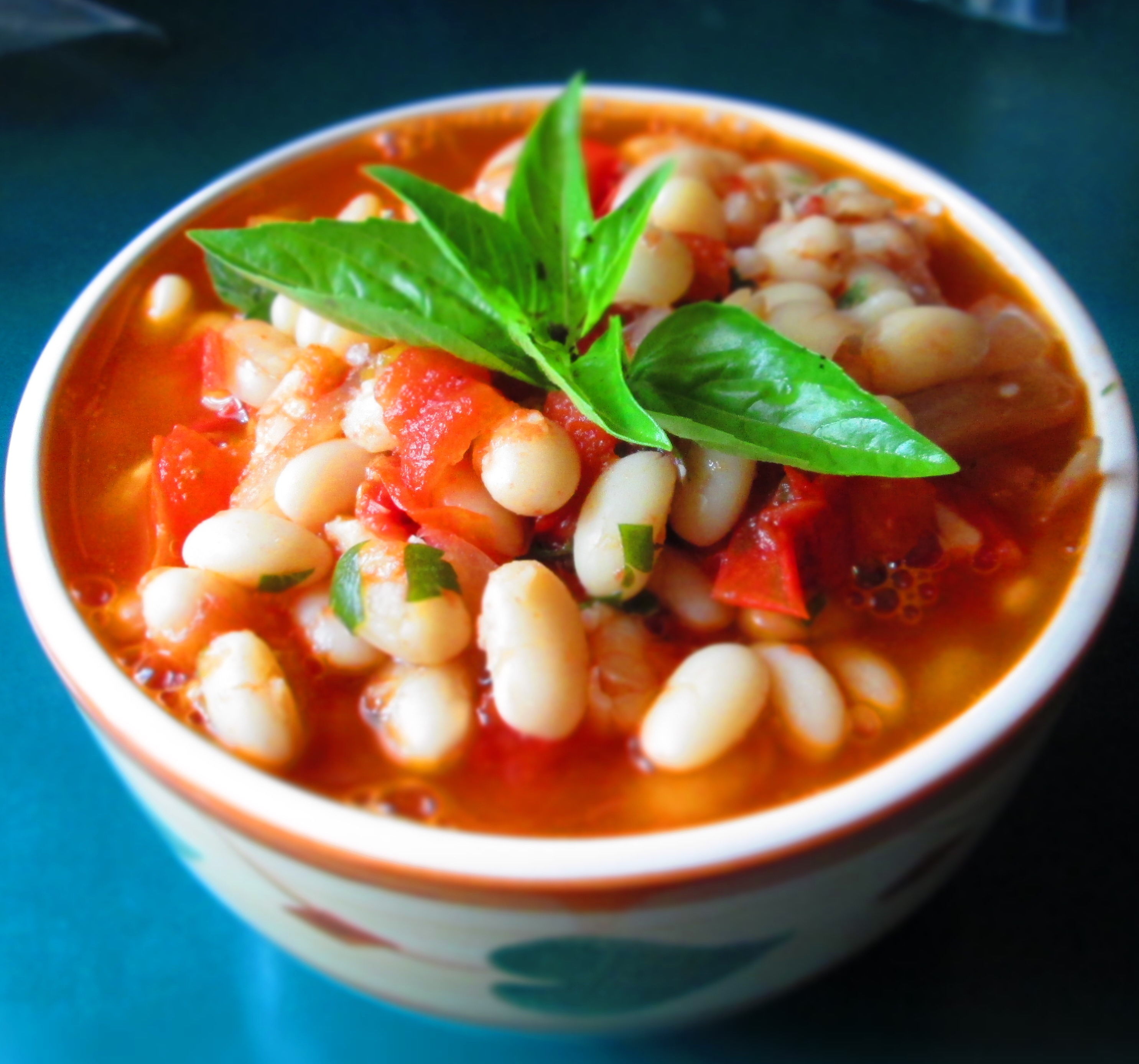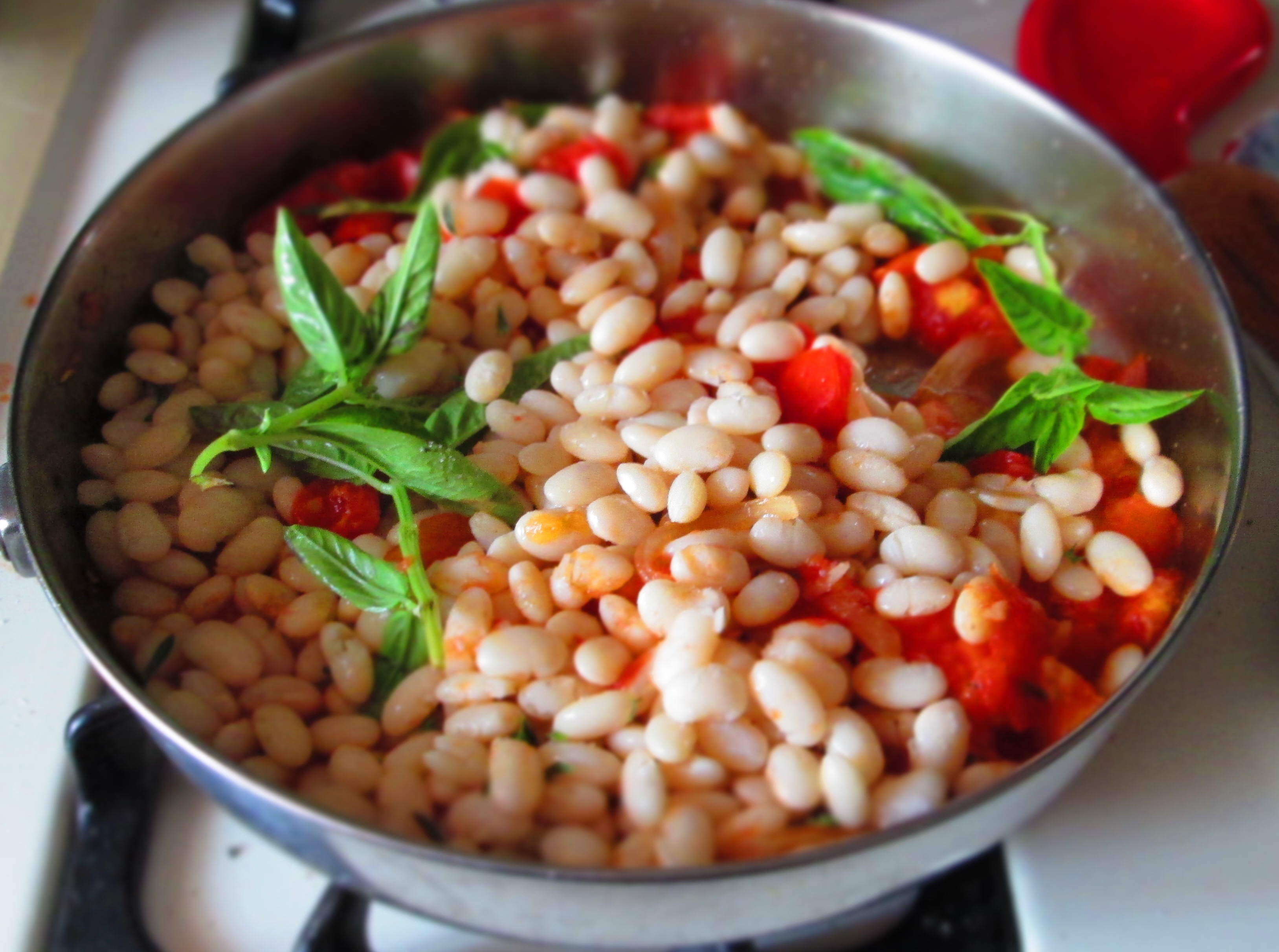 Sometimes you go through your pantry or refrigerator and see a bunch of stuff that you know you have to use or it will go bad. It’s been that way with me and all of these dried beans I realized I had. And since it’s summer, I also find myself with a steady influx of tomatoes.