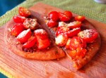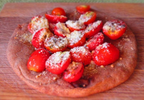1 (8-inch) whole wheat flatbread 1 cup cherry tomatoes, halved 1 tablespoon extra virgin olive oil ½ teaspoon sea salt Freshly ground black pepper Herbs or seasonings of your choice (such as basil, oregano, cayenne) 2 tablespoons parmigiano