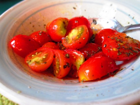 In a medium bowl combine all the ingredients and mix.Spread the tomatoes and herbs out on a small-medium baking sheet. (You can line it with foil or parchment, if you like.)Bake for 1 hour. Stir the tomatoes, then bake for another 1½ hours. The tomatoes should be wrinkled and easily burst when poked with the tip of a knife. Some tomatoes may burst while in the oven, and some may brown a bit. This is not only okay, it’s deliciously desirable.Transfer everything to a clean, pint-size jar with a tight-fitting lid. Pour in any oil and juices from the pan. Pack in it gently. Cover the tomatoes with oil. Seal. Tomatoes will keep up to a week in the refrigerator.