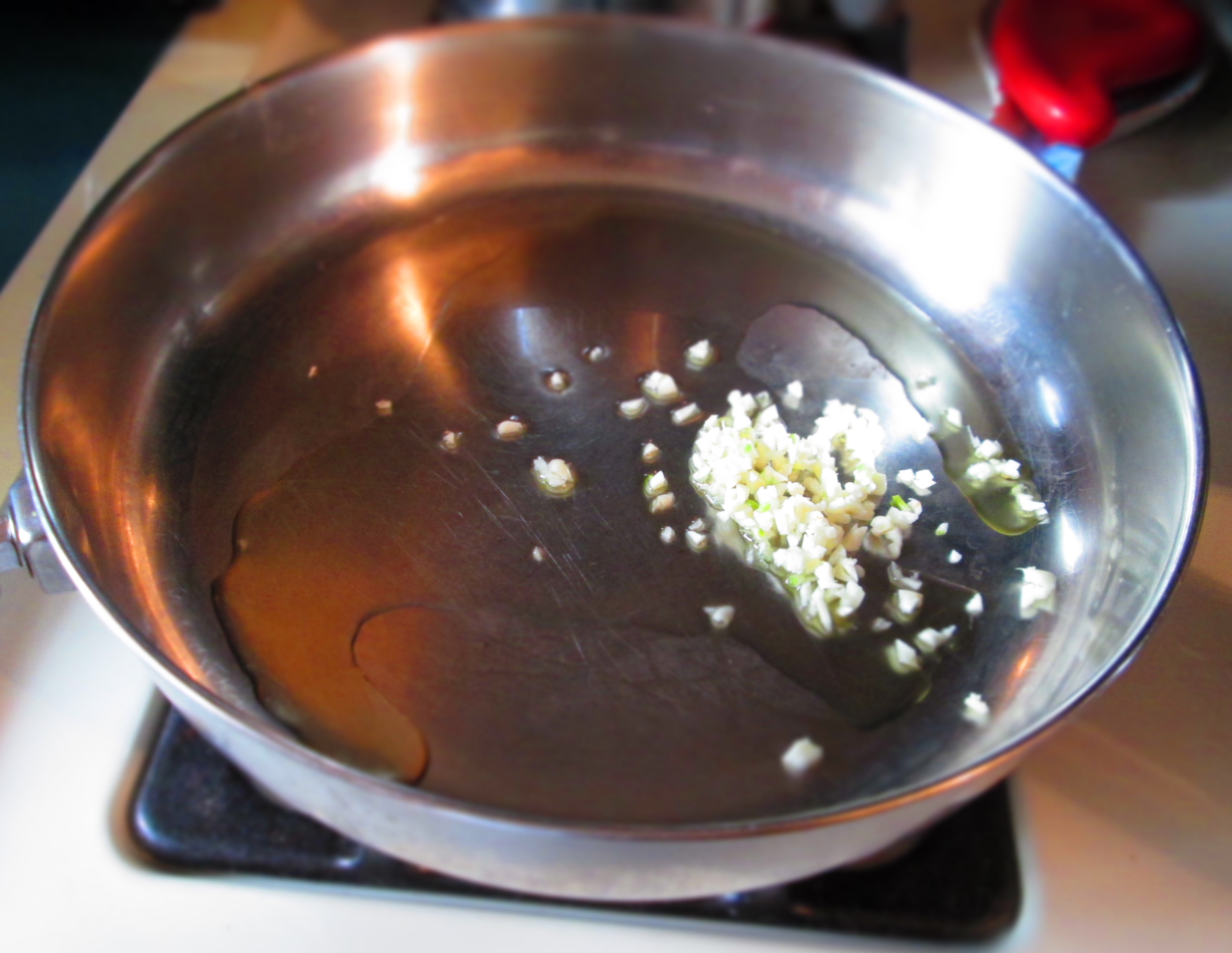 Heat the oil in a wide pan; add the garlic and sauté until fragrant, about one minute.