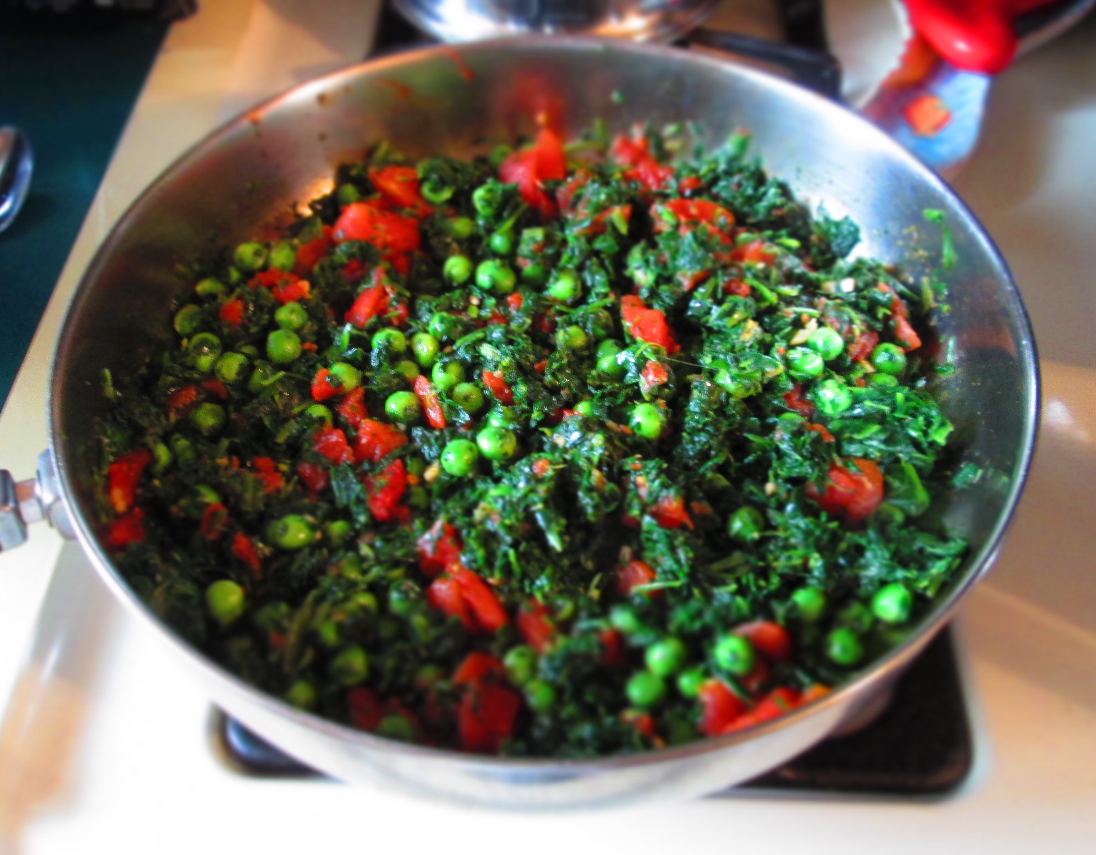 Stir in the spinach, black-eyed peas, and peas and sauté another 3 minutes.